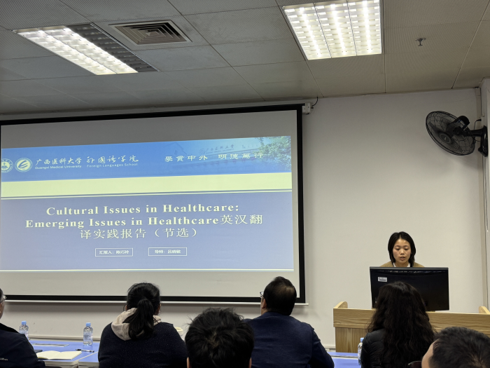 23级翻译专业的两名硕士研究生李可和陈巧玲进行了汇报。李可以“纽马克翻译理论指导下的医学文献英汉翻译实践报告——以《Rosacea, microbiome and probiotics the gut-skin axis》为例”为主题,从纽马克的语义翻译和交际翻译理论出发,系统阐述了在医学文献翻译中所面临的难点与应对策略。陈巧玲以“Cultural Issues in Healthcare: Emerging Issues in Healthcare 英汉翻译实践报告(节选)”为题,结合翻译案例从词汇和句法层面展开分析,探讨了纽马克交际翻译理论对翻译实践的指导作用。副经理吕晓敏作为本期主要点评硕导,在点评时肯定了案例分析的系统性和多样性,提出了增加典型案例数量、补充数据支撑、完善目标读者评估等建议,以增强论文的严谨性和创新性。其他硕导对两位汇报同学进行了指导并给出的修改建议。